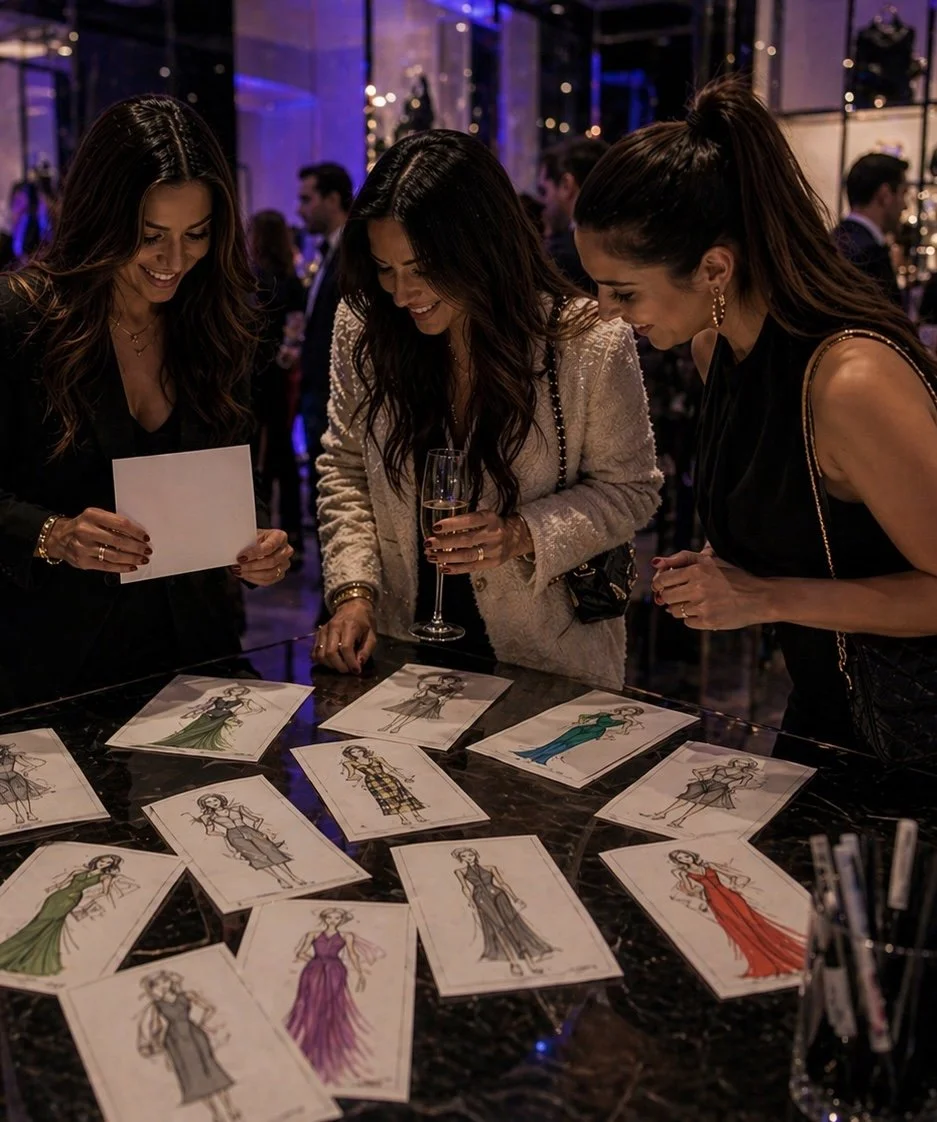 Live sketches created on 4×6 postcards, capturing guests and their looks through a loose, expressive interpretation of my style. Offered as paper or digital illustration.
