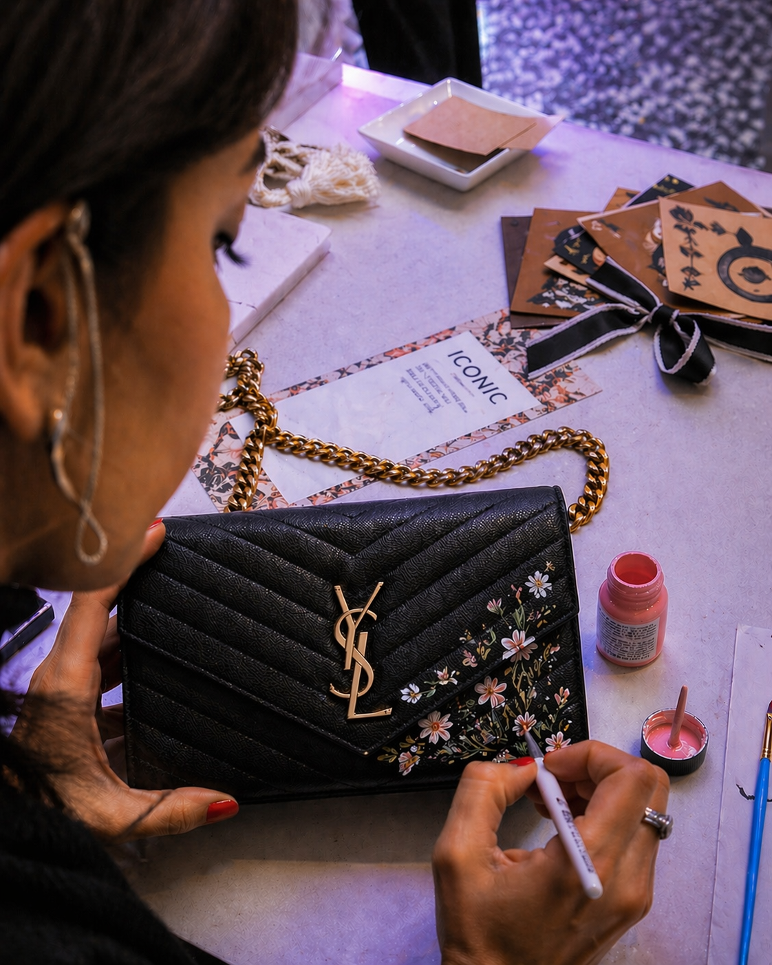 Hand-painting on handbags, shoes, and small leather goods, using minimal, refined designs; from subtle initials to signature florals and linework.